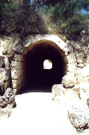 bodies The entrance to the tunnel is in the left hand corner of the locker room. It is one of the earliest true vaults in the Mediterranean (late 4th century BC). Look out for the ancient graffiti, where athletes waiting for their turn scratched their name (and sometimes added kallos, beautiful.) The stadium runs from south to north with the southern end built into the natural amphitheatre between the ridges of Evangelistra Hill. The track was 600 feet long (this was the unit of measurement called stadion.) Round the sides was a stone channel which brought fresh water for drinking and for wetting the track surface. We can see several 'settling basins'which may have been to collect dirt and/or for drinking from. Most of the 100 foot marker posts remain at the sides of the track. The races were run down the length and back, not round the edge as now, with the runners turning round a post at the end; one of these has been restored for the modern games. The judges, a panel of ten men from Argos who wore black in memory of the baby Opheltes, sat on a wooden platform on the side opposite the tunnel entrance The spectators sat on the banks on ledges roughly cut out of the soil; coins found at the site show that, as at a modern football match, the supporters from each city state sat together. The only stone seats are opposite viewing point 10. The only prizes were a palm branch and a fillet tied round the head for the winners and a crown of wild celery for all the athletes. The winner had a free meal every day for life from his home town.